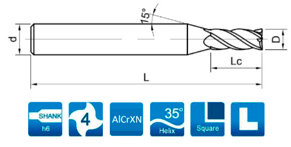 - Наличие переменных углов наклона спирали и специальной геометрии канавок обеспечивает эффективное гашение вибраций при фрезеровании вертикальных стенок.