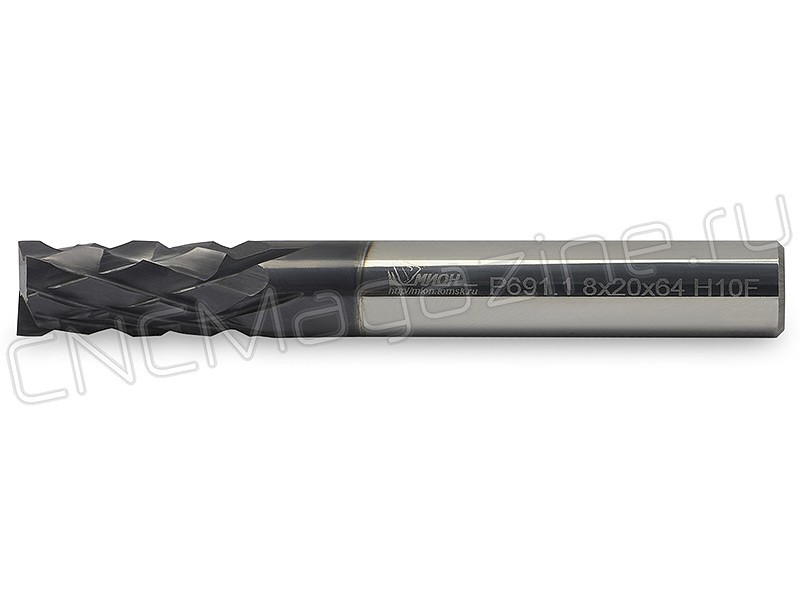 Твердосплавная фреза-роутер Р691.1 8-20-64-C8 для обработки композитных материалов, пластика, стекловолокна, цилиндрическая с плоским торцом, крупная насечка. Фрезерование пазов и уступов. Твердый сплав H10F. Диаметр фрезы 8 мм, длина рабочей части 20 мм, общая длина 64 мм. Диаметр цилиндрического хвостовика 8 мм, допуск на диаметр: H7. Угол наклона спирали 20°. Количество зубьев на торце − 2. Износостойкое покрытие TiALN. Группа обрабатываемых материалов: N (композитные материалы).
