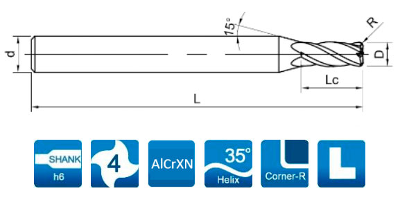 - Подходит для фрезерования пазов, боковых поверхностей и контуров. Обладает повышенной устойчивостью к сколам, как по радиусам углов, так и по периферийным участкам режущих кромок.