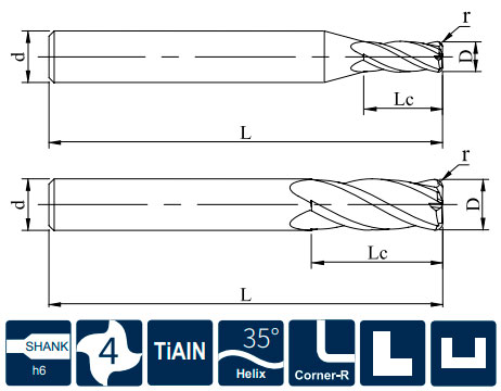 Фреза монолитная твердосплавная по металлу для фрезерного станка, радиусная. Диаметр - 8 мм, радиус - 0,5 мм. Длина рабочей части - 20 мм, общая длина - 60 мм. Диаметр хвостовика - 8 мм. Угол наклона спирали 35°. Количество зубьев - 4. Группа обрабатываемых материалов: M (P, K,S).