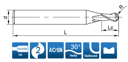 Фреза монолитная твердосплавная по металлу для фрезерного станка, сферическая. Диаметр - 5 мм, радиус - 2.5 мм. Длина рабочей части - 10 мм, общая длина - 50 мм. Диаметр хвостовика - 6 мм. Угол наклона спирали 30°. Количество зубьев - 2. Группа обрабатываемых материалов: P, M. K.