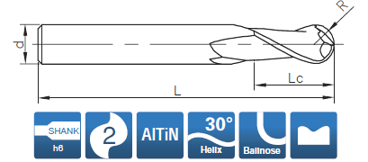 Фреза монолитная твердосплавная по металлу для фрезерного станка, сферическая. Диаметр - 4 мм, радиус - 2.0 мм. Длина рабочей части - 8 мм, общая длина - 75 мм. Диаметр хвостовика - 4 мм. Угол наклона спирали 30°. Количество зубьев - 2. Группа обрабатываемых материалов: H.