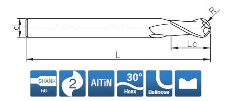 Фреза монолитная твердосплавная по металлу для фрезерного станка, сферическая. Диаметр - 10 мм, радиус - 5 мм. Длина рабочей части - 15 мм, общая длина - 100 мм. Диаметр хвостовика - 10 мм. Угол наклона спирали 30°. Количество зубьев - 2. Группа обрабатываемых материалов: P. H.