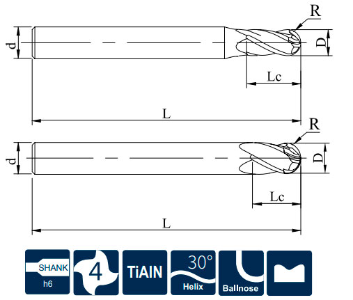 Фреза монолитная твердосплавная по металлу для фрезерного станка, сферическая. Диаметр - 4 мм, радиус - 2 мм. Длина рабочей части - 8 мм, общая длина - 50 мм. Диаметр хвостовика - 4 мм. Угол наклона спирали 30°. Количество зубьев - 4. Группа обрабатываемых материалов: M (P, K,S).