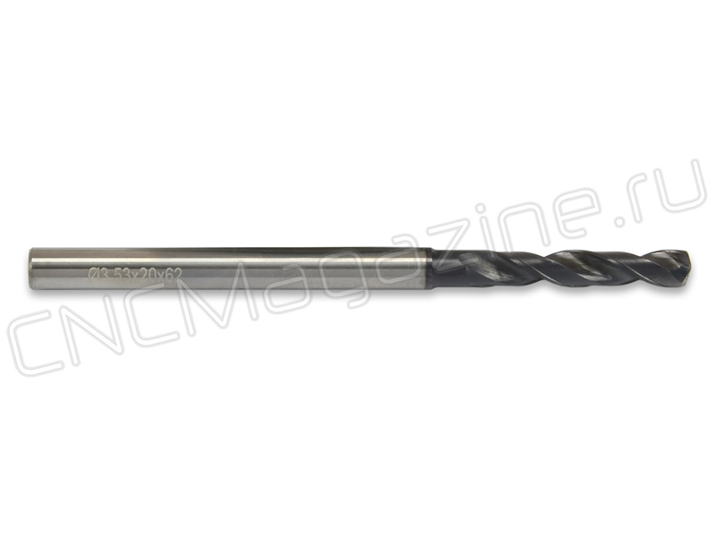 Сверло спиральное из твердого сплава, с цилиндрическим хвостовиком. Диаметр сверла 3.53 мм, длина рабочей части 20 мм, общая длина 62 мм.