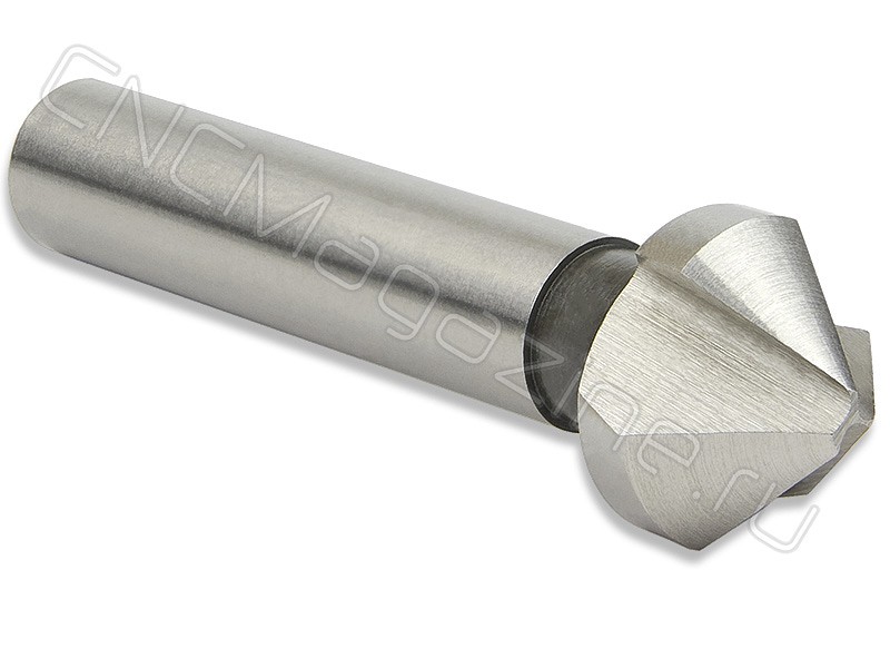 Зенковка коническая по металлу, наибольший диаметр 25 мм, угол при вершине 90 градусов, HSS Co5 (быстрорежущая сталь Р6М5 с добавлением кобальта 5%), стандарт DIN 335, форма C. Три режущие кромки, хвостовик цилиндрический. Инструмент для финальной обработки отверстий, получения конической фаски (зенкования) и снятия заусенцев.