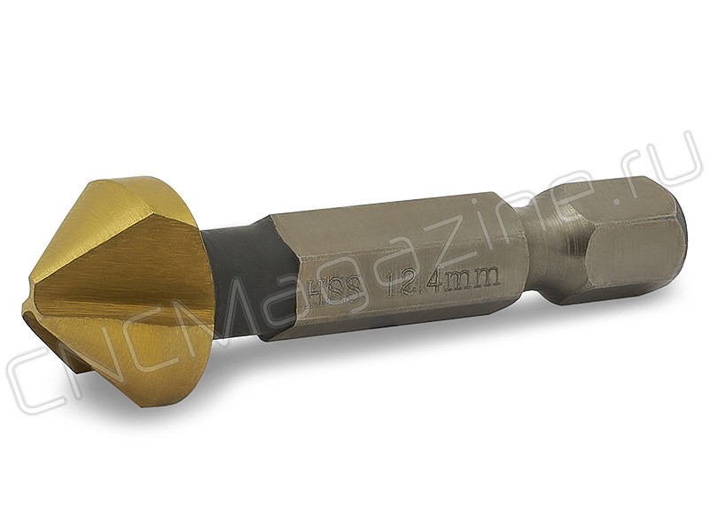 Зенковка 12.4 мм, стандарт DIN335, форма C (коническая зенковка с шестигранным хвостовиком, с тремя режущими гранями 90°).