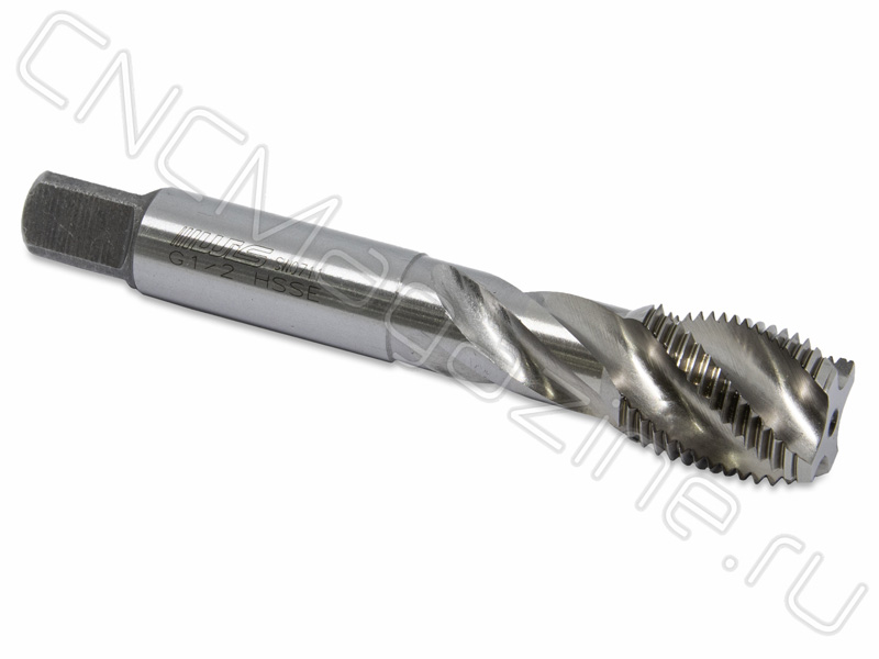 Метчик из быстрорежущей стали HSS-E со спиральной стружечной канавкой с углом спирали 38 градусов. Для глухих отверстий. Для нарезания дюймовой резьбы G1/2 в стальных деталях.