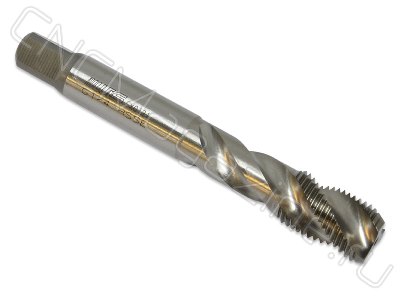 Метчик из быстрорежущей стали HSS-E со спиральной стружечной канавкой с углом спирали 38 градусов. Для глухих отверстий. Для нарезания дюймовая резьбы G1/4 в стальных деталях.