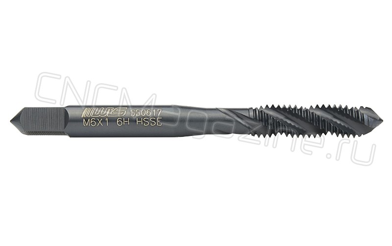 Метчик из быстрорежущей стали HSS со спиральной стружечной канавкой. Для глухих отверстий. Метчик спиральный для нарезания метрической резьбы М6 c шагом 1 мм в стальных деталях.