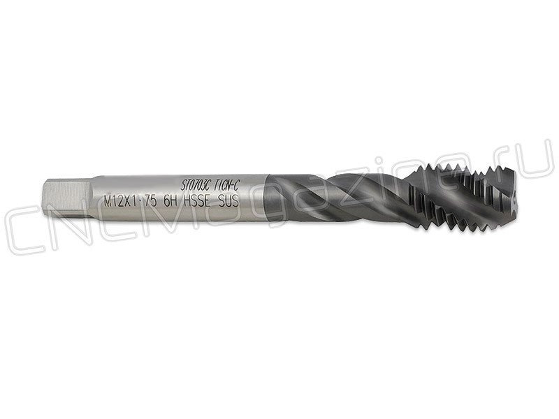 Метчик из быстрорежущей стали HSS-E со спиральной стружечной канавкой с углом спирали 38 градусов. Для глухих отверстий. Для нарезания метрической резьбы М12 c шагом 1.75 мм. С покрытием SUS TiAlN.
