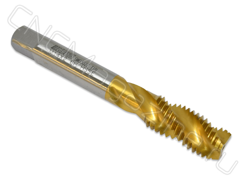 Метчик из быстрорежущей стали HSS-E со спиральной стружечной канавкой с углом спирали 38 градусов. С покрытием TiN. Для глухих отверстий. Для нарезания метрической резьбы М14 c шагом 2 мм в стальных или чугунных деталях.