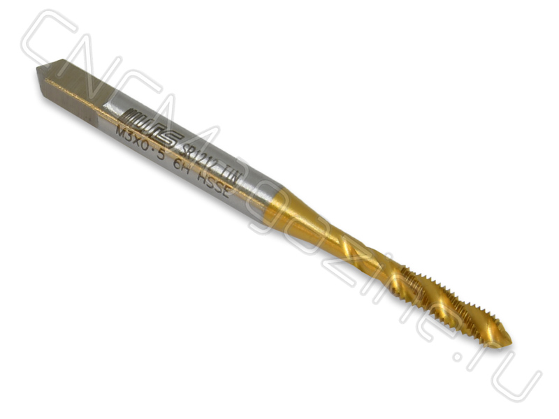 Метчик из быстрорежущей стали HSS-E со спиральной стружечной канавкой с углом спирали 38 градусов. С покрытием TiN. Для глухих отверстий. Для нарезания метрической резьбы М3 c шагом 0,5 мм в стальных или чугунных деталях.