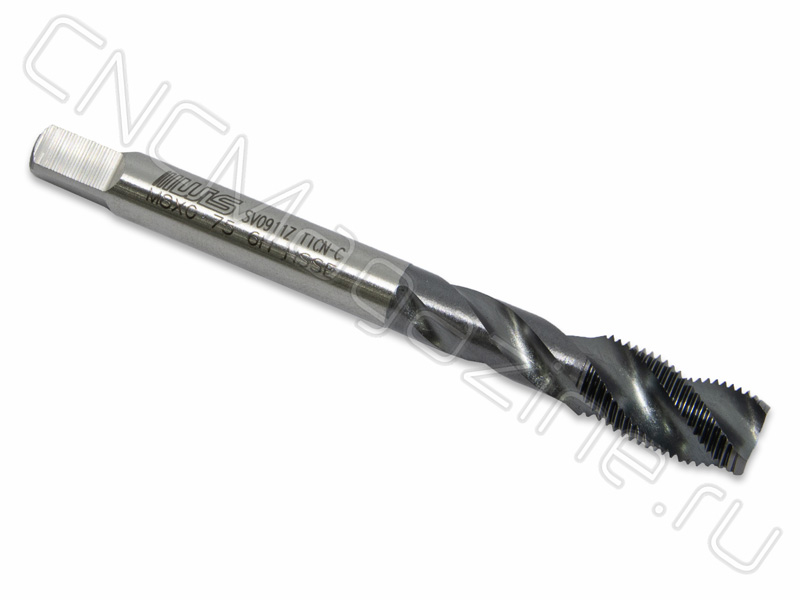 Метчик из быстрорежущей стали HSS-E со спиральной стружечной канавкой с углом спирали 38 градусов. С покрытием TiAlN. Для глухих отверстий. Метчик спиральный для нарезания метрической резьбы М8 c шагом 0,75 мм в стальных или чугунных деталях твердостью до 20 HRC.