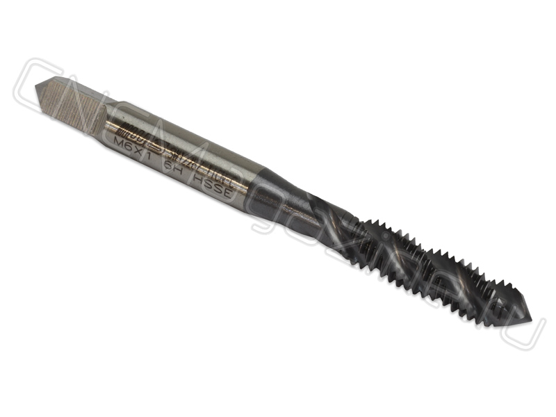 Метчик из быстрорежущей стали HSS-E со спиральной стружечной канавкой с углом спирали 38 градусов. С покрытием TiAlN. Для глухих отверстий. Метчики винтовые для нарезания метрической резьбы М6 c шагом 1 мм в стальных или чугунных деталях твердостью до 20 HRC.