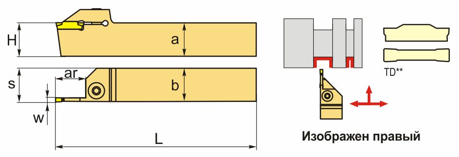 Резец токарный отрезной по металлу со сменными пластинами. Для пластин TD*6 (YG-1). Для отрезки и обработки наружных канавок.