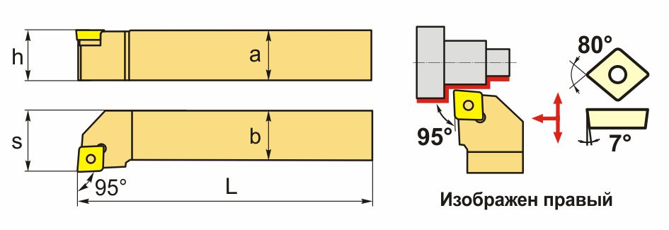 Резец токарный для наружного точения по металлу со сменными пластинами. Державки для токарных пластин CC**09T3**. Державка токарная с креплением типа S (закрепление пластин винтом). С углом в плане 95°.